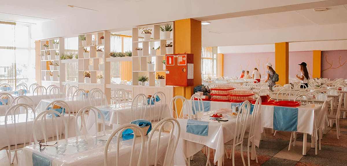 6 местные номера с удобствами в номере (душ, туалет, раковина). В каждом номере: кровати с ортопедическими матрасами, прикроватные тумбочки, стол, стулья, шкаф для одежды, обувница. В спальных корпусах имеются стиральные машины - автомат для стирки детских вещей, отдельные помещения для стирки и глажки белья, сушилки для одежды.