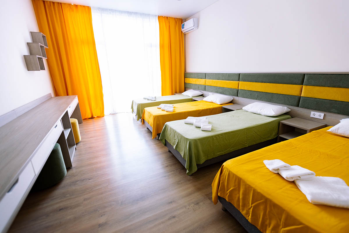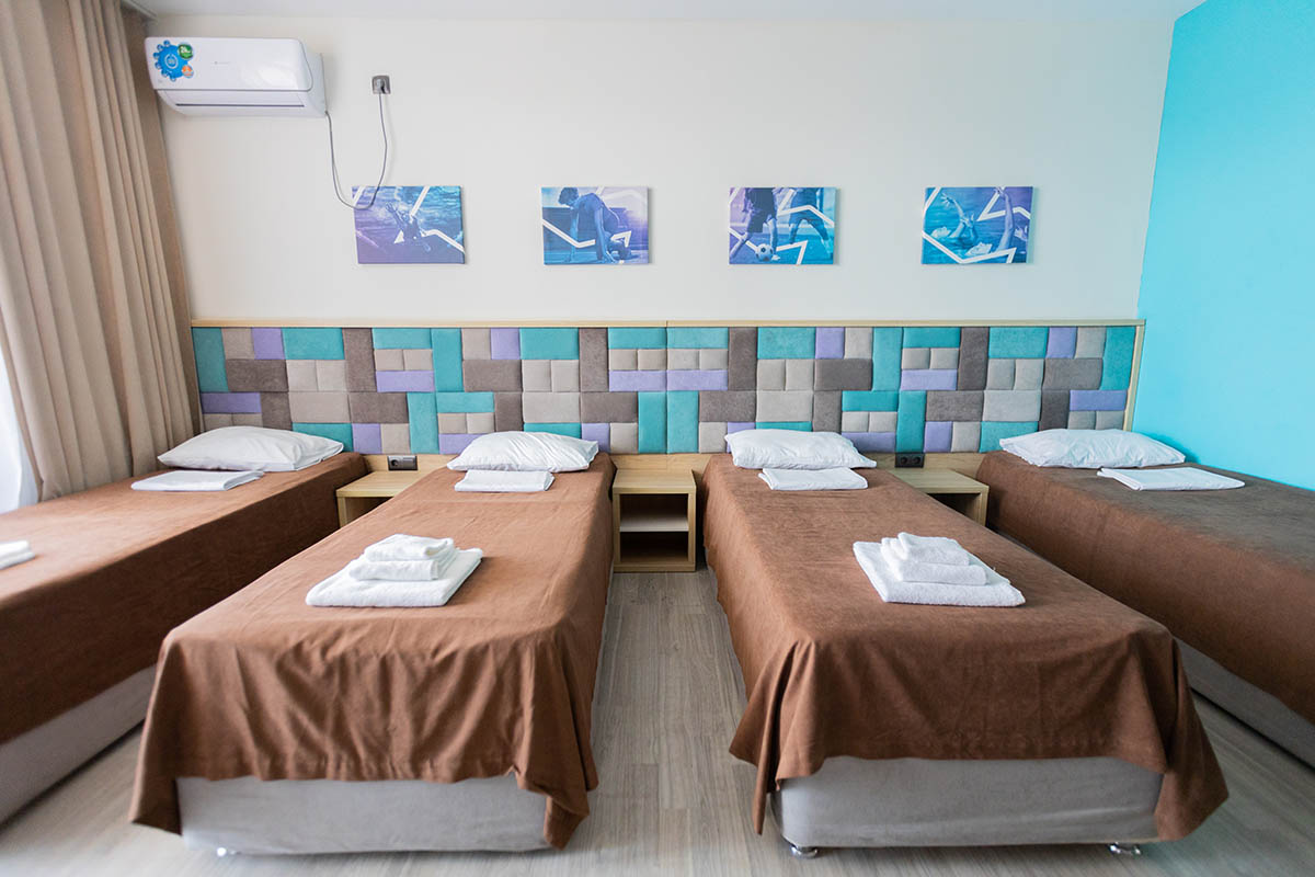 «Вита», «Посейдон», «Аврора» - стандартное 2-4 местное размещение с удобствами в номере. В каждом номере: кровать, шкаф, тумбочка, прикроватный коврик, сушилка для купальных принадлежностей, санузел (душ, туалет).